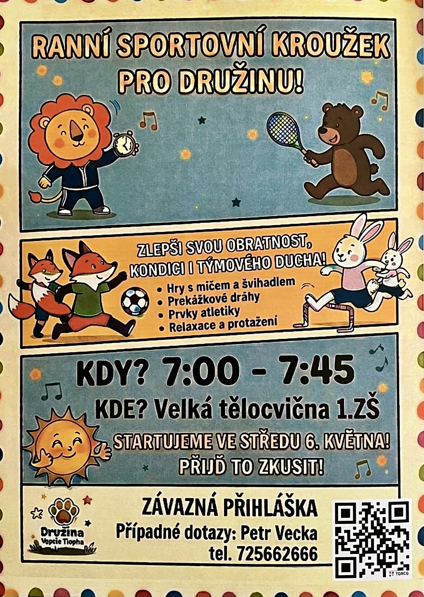 Od 6. května začíná pracovat ranní sportovní kroužek pro žáky prvních a druhých tříd.